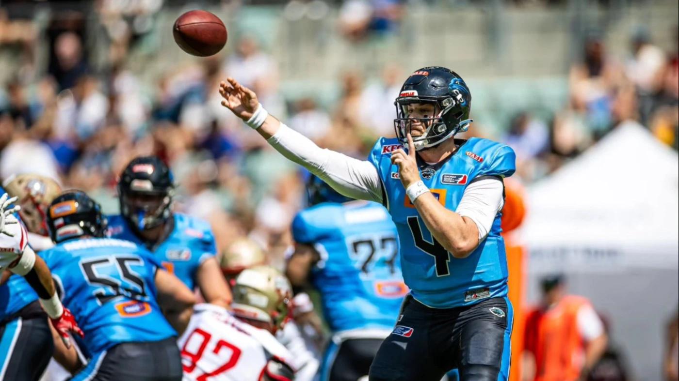 The Stuttgart Surge debuted their new black uniforms with a 27-5 win over the Munich Ravens in front of a passionate crowd at Prezero Arena. Both teams exchanged field goals to start the game in a physical and defense-focused first half of play. The Surge gained the lead with a 51-yard field goal from kicker Lenny Krieg, followed by an impressive two-minute drive before the half, that culminated in quarterback Reilly Hennessey finding Jan Peitsch for a receiving touchdown with only seconds remaining before the break.